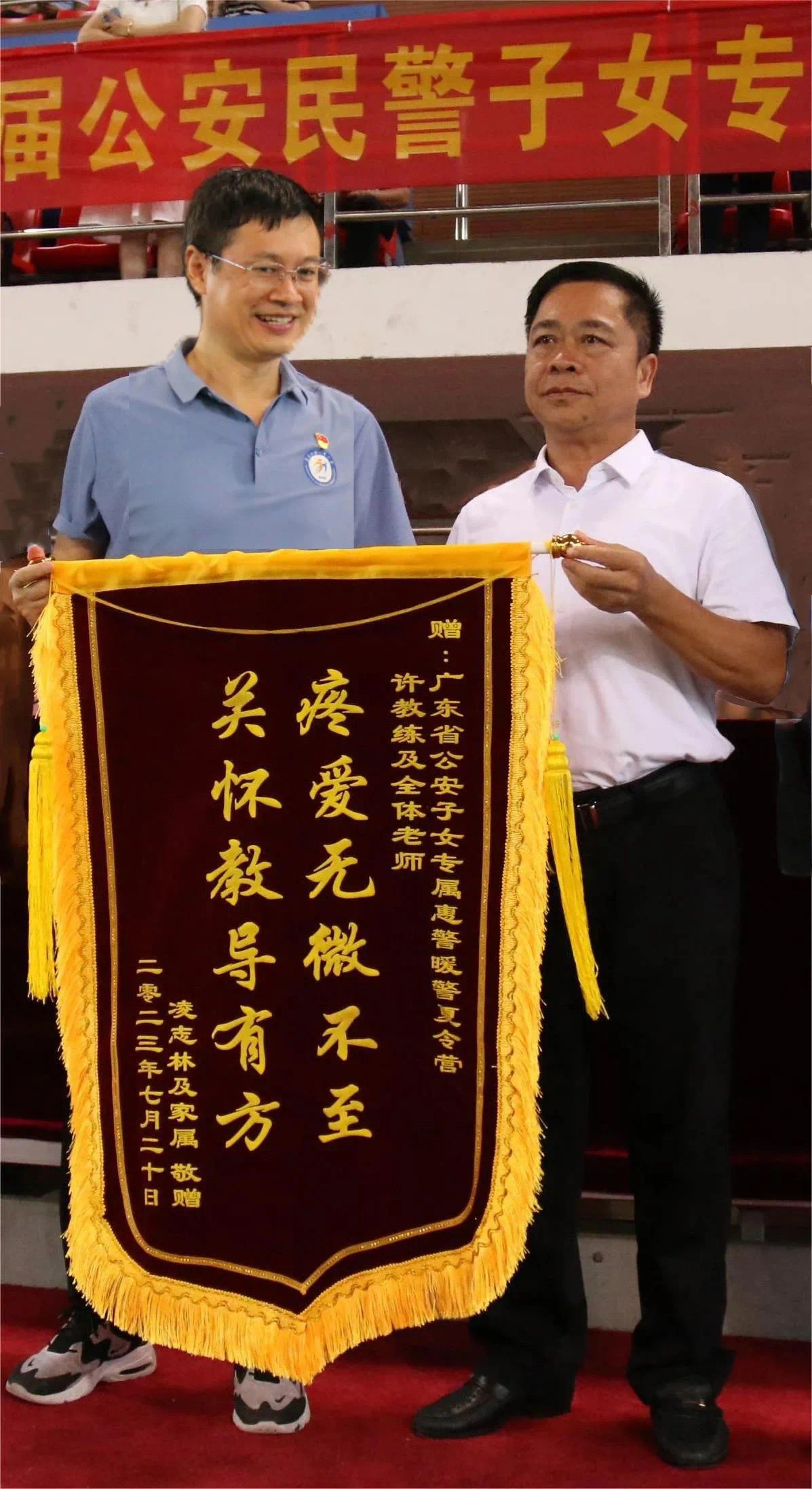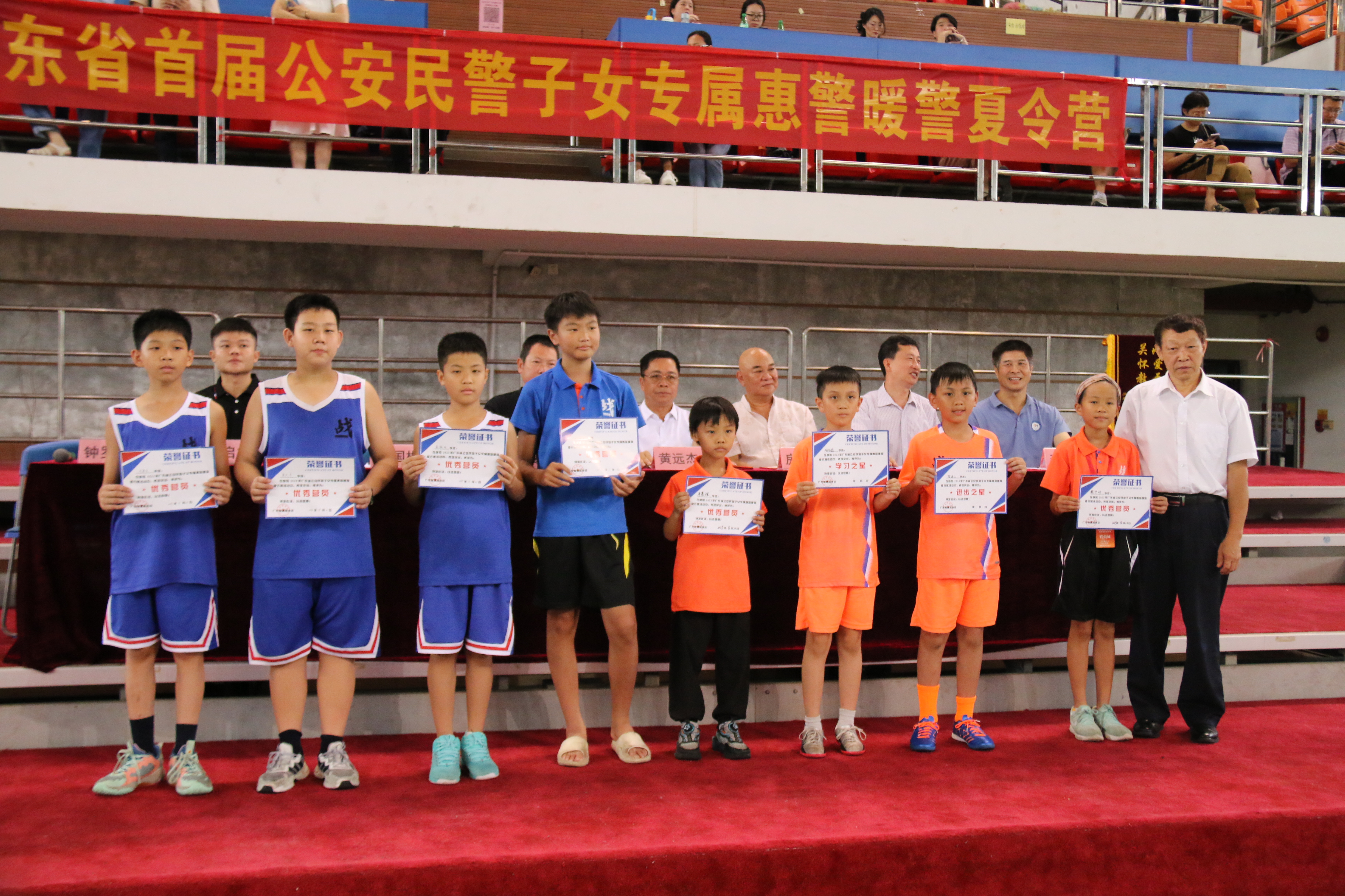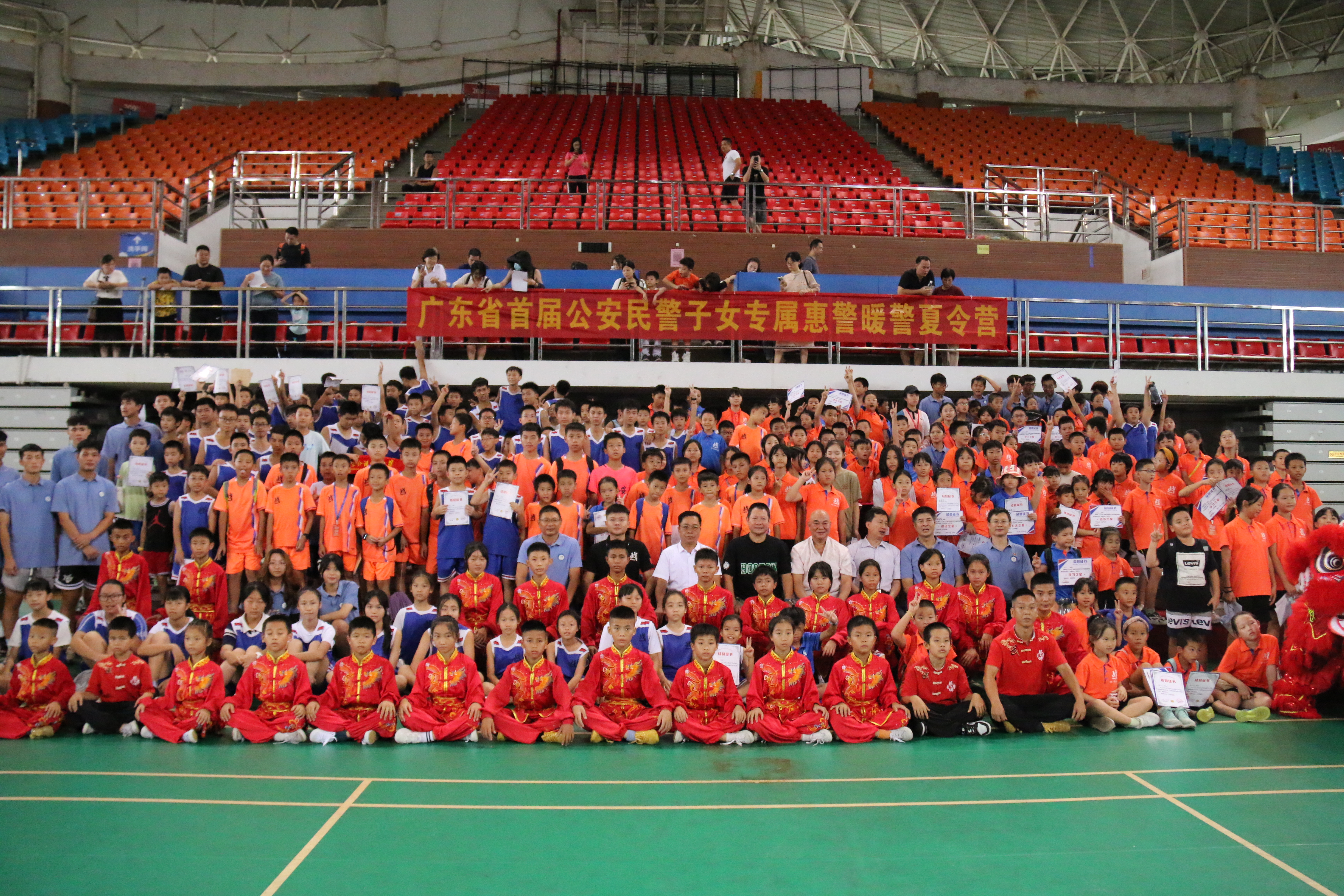 本网讯 烈日灼灼,赫赫炎炎。8月22日上午,2023年广东省首届公安民警子女专属惠警暖警夏令营闭营仪式在广外大学城校区体育馆举行。仪式由我校体育部党总支书记钟罗军主持,广东省警察协会常务副会长,原省公安厅原党委委员丶副厅长彭会,广东省警察协会副会长兼秘书长省消防局原政委黄远杰,广东省警察协会副秘书长马学全,教育部广州大学城及周边地区高校国家大学生文化素质教育基地主任,广东省人力资源研究会会长,广东外语外贸大学原副书记副校长许国彬,北胜蔡李佛传承人、广东省武术协会副会长、广东外语外贸大学客座教授房胜棠,广州特战体能赢竞技体育服务公司总经理朱启文,广东外语外贸大学体育部主任李旭武等出席,夏令营第四期学员及教练、工作人员等约500人参加。