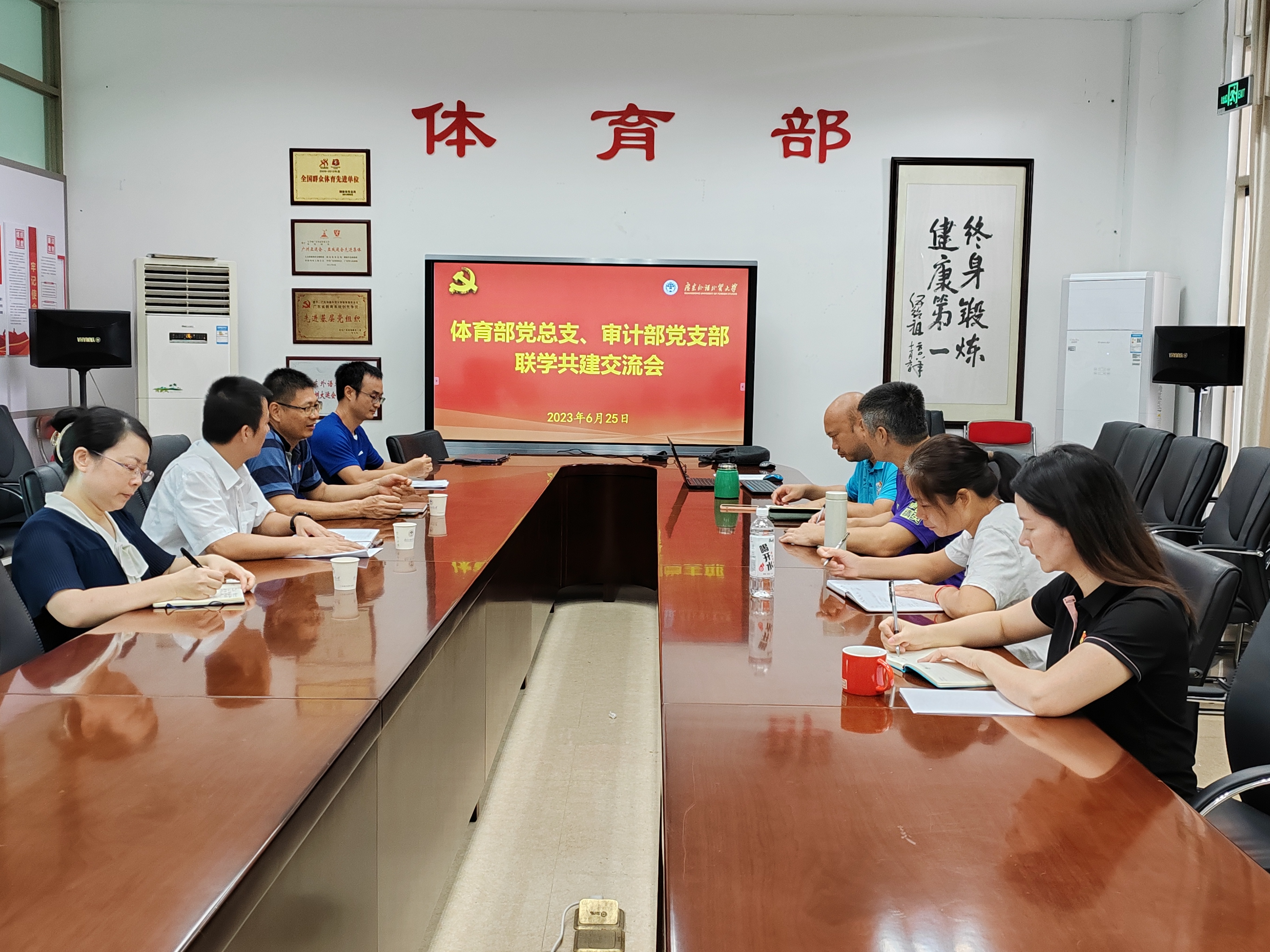 本网讯 6月25日,体育部党总支和审计工作部党支部在白云山校区体育部会议室联合开展以“学习贯彻习近平总书记关于审计工作的重要讲话精神”为主题的,学习贯彻习近平新时代中国特色社会主义思想主题教育。体育部党总支书记钟罗军,体育部主任、党总支副书记李旭武,审计工作部党支部书记曾健文及有关代表参加联学。