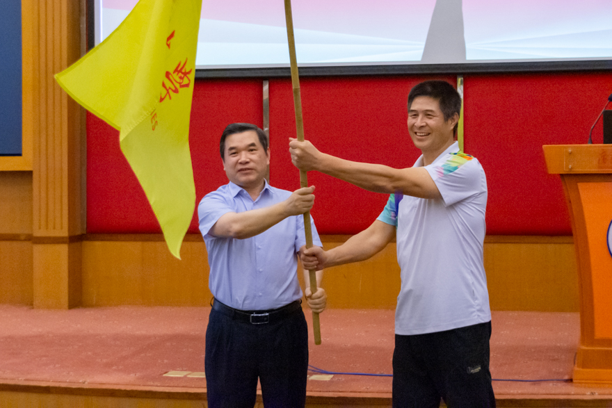 5月5日下午,我校代表团举行广东省第十一届大学生运动会出征仪式,仪式在行政楼国际会议厅举行。副校长、代表团团长焦方太作动员讲话并为代表团授旗。仪式通过线上线下结合的方式进行。