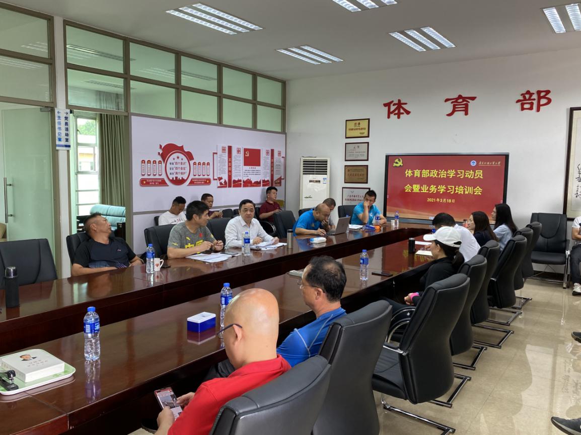 在政治学习动员会暨业务学习培训会上,何伟儒传达了“巡视工作动员会精神”、“党史学习教育”、“两会精神学习”的要求,通报体育部管理制度文件汇编事宜,并强调要在疫情防控工作常态化下开展各项工作;李旭武传达了学校科研工作会议、人事人才工作会议以及学校2021年工作要点,提醒教师做好职称晋升多项准备;王鲁江传达校工会“关于组织工会会员参加 《广东省职工医疗互助保障计划》的通知”和要求;黄德沂、蔡德亮就学生体质测试成绩纳入体育课程成绩后课堂操作、排课等事宜进行了说明;黄超群就运动队训练注意事项提出了要求。