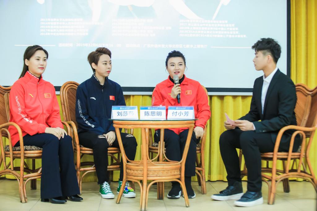 12月6日下午,中国美式台球国家队付小芳、陈思明、刘莎莎三位世界冠军及教练走进了广东外语外贸大学,与我校师生进行面对面交流。中国台球协会美式台球项目委员会副主任陈蔚;我校工会常务副主席林少娜;体育部主任李旭武、党总支书记何伟儒;学生处副处长叶开;团委副书记涂颖;体育部副主任王鲁江、黄德沂;我校台球球手廖忠于、全永白以及师生代表参加了活动,活动现场座无虚席。据悉,本次台球世界冠军到广外举行的师生面对面活动尚属首次。
