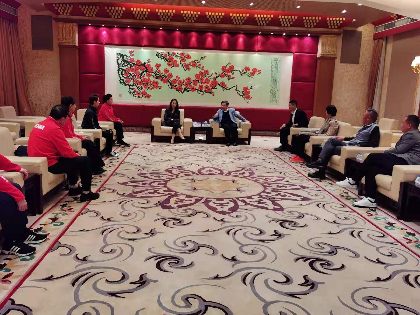 与师生面对面活动结束后,焦方太副校长在北校区贵宾厅接见了台球世界冠军国家队。焦方太向对方介绍了学校体育工作有关情况,然后中国台球协会美式台球项目委员会副主任陈蔚介绍了中国美式台球的发展情况,三位世界冠军分享了自己“不忘初心、为国争光”的心路历程。最后,双方互赠纪念品并进行合影。
