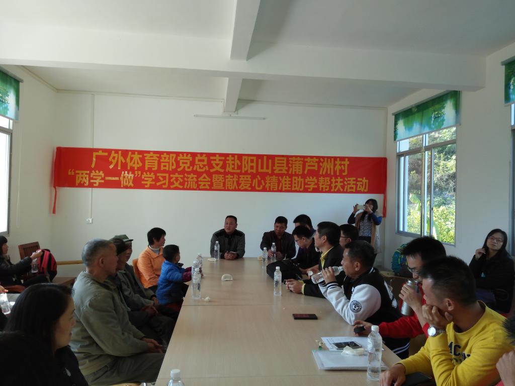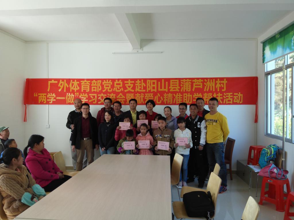 经过三个半小时的旅途奔波,来到我校扶贫定点村蒲芦洲村委,党员与接受助学帮扶的小朋友和家长座谈,了解他们的家庭情况和学习情况,体育部党员群众10人自发资助7名家庭困难的小学生每人1000元的助学金,并签订“精准助学计划项目意向书”,希望受资助家庭用好该笔资金,努力学习,回报社会。