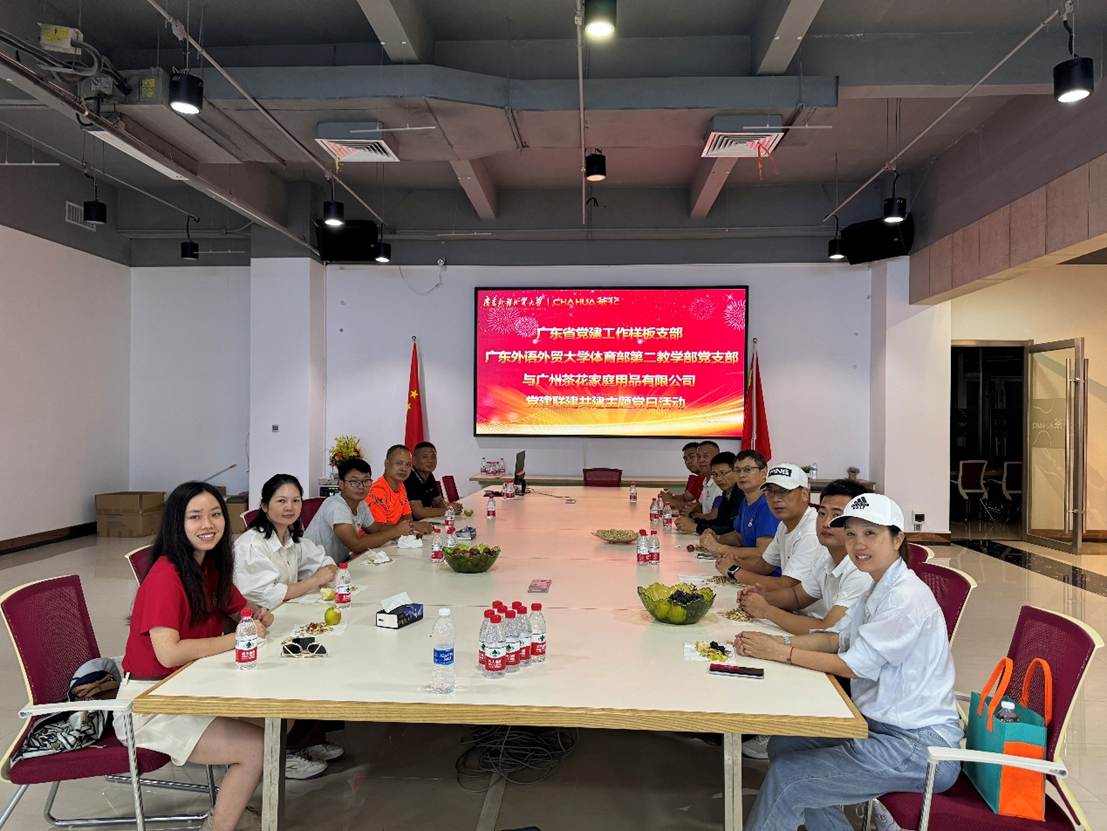 活动首先来到广州茶花家庭用品有限公司。在亲切的交流中,体育部党总支深入了解企业党建引领生产、塑造企业文化的生动实践,对其将党的组织优势转化为发展动能的成效深表赞赏。同时,体育部党员积极发挥专业特长,围绕“党建+体育”特色纽带,为企业员工健康管理、团队凝聚力提升等献计献策。双方就如何通过定制化体育活动、健康讲座等形式,将体育部专业优势深度融入企业员工关怀与文化建设,推动企业高质量发展进行了深入探讨并达成初步合作意向。体育部党总支立足专业、服务校友企业的务实举措,为校企合作注入了强劲动能。