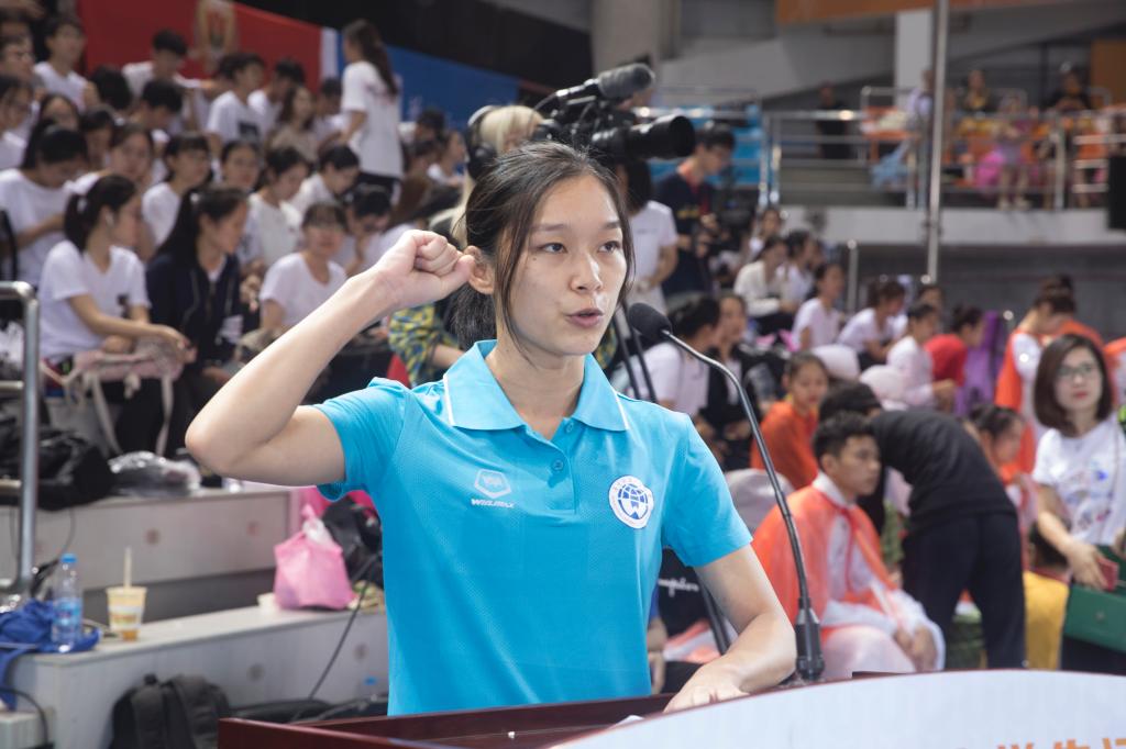 随后,我校田径队队员陈燕霞代表运动员宣誓,承诺在比赛中弘扬体育精神,遵守比赛规则,赛出风格,赛出水平,为校争光
