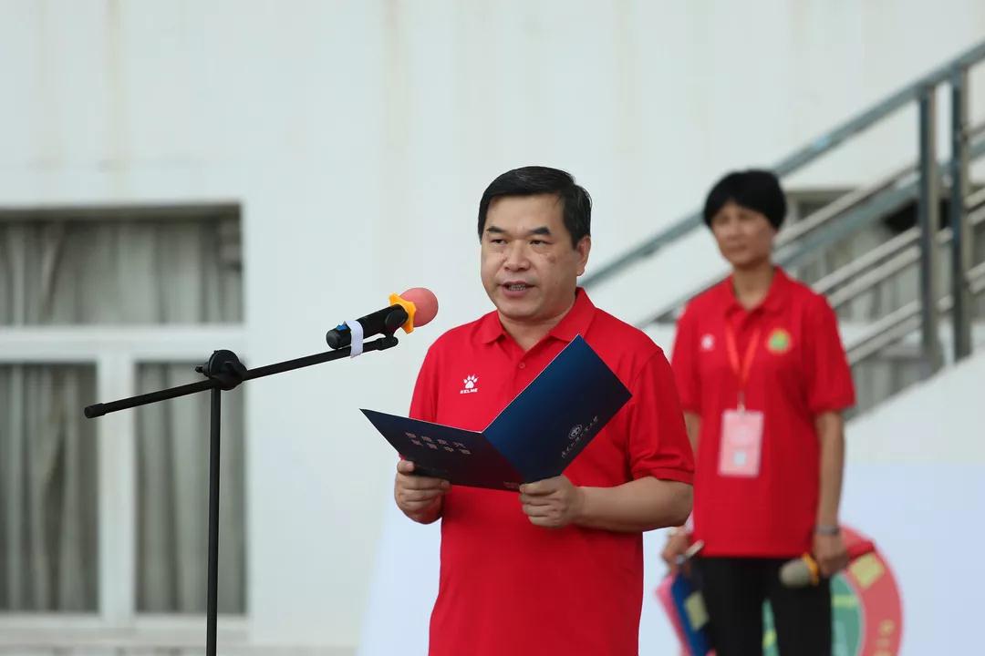 广东省教育厅副巡视员邱克楠宣布2018年全国青少年校园足球夏令营(初中组)第八营区开营。在运动员和裁判员宣誓之后是精彩的花式足球表演和舞狮表演。