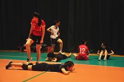 今年广外女排将代表广东外语外贸大学参加2015年第九届大运会,女排赛程安排在5月27号至6月7号。其中,有两名大四的师姐克服工作、考研的压力,坚持训练,为在这四年一次的大运会上获得成功而努力。女排队员们在平日里会有下午两个半小时的训练,还有星期天全天的训练。而为了备战本届大运会,女排队员们加强了训练的强度,为了星期天早上能够准时并且有精神地训练,北校的队员会在星期六晚上过来南校住宿。另外她们还会为自己进行加量的练习,主要是进行体力的加强,练习基本功,打好基础。而平时球队的练习就由跑步等基础练习和扣球、防守、拦球等技术性练习为主。