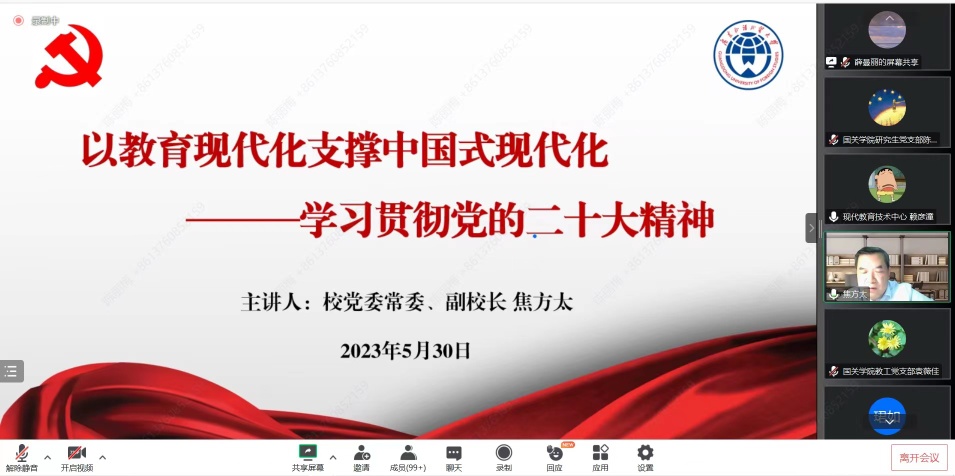 本网讯 5月30日晚,体育部邀请校党委常委、副校长焦方太作题为《以教育现代化支撑中国式现代化——学习贯彻党的二十大精神》的主题教育专题党课,体育部全体教职员工参与本次活动,线上参加党课的还有国关学院师生和现代教育技术中心的党员教师共计230人。