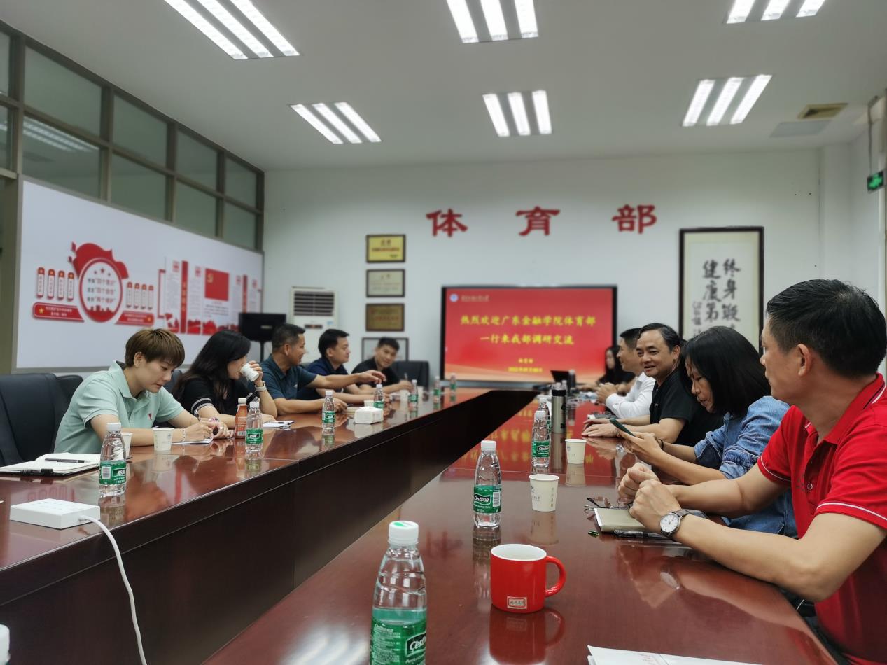 2022年9月8日下午,广东金融学院体育教研部主任、直属党支部副书记曾播思,直属党支部书记何进江,副主任张泳华、江炬及四名教师来我部调研交流。我部主任、党总支副书记李旭武,党总支书记何伟儒,副主任黄德沂及六名中层干部参加了座谈会。