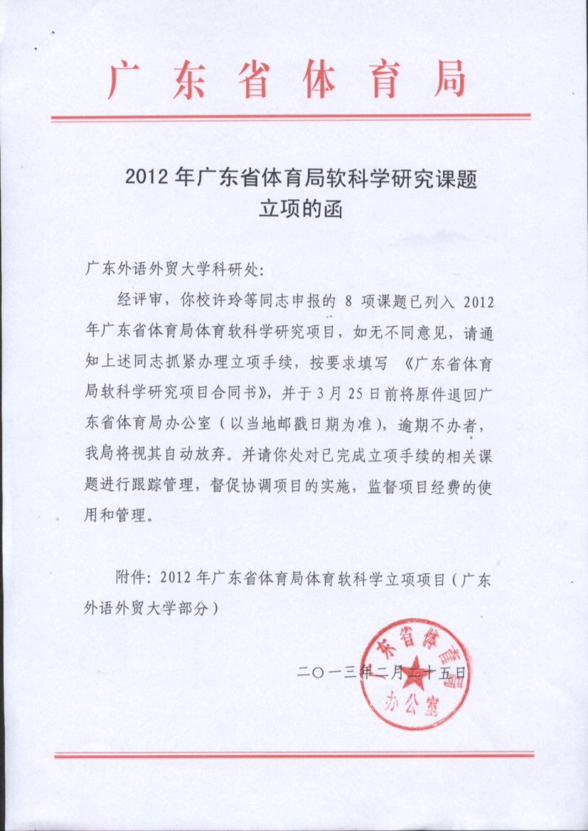 本网讯 体育部在2012年底申报广东省体育局软科学课题共14项,其中有8项获广东省体育局软科学课题立项。