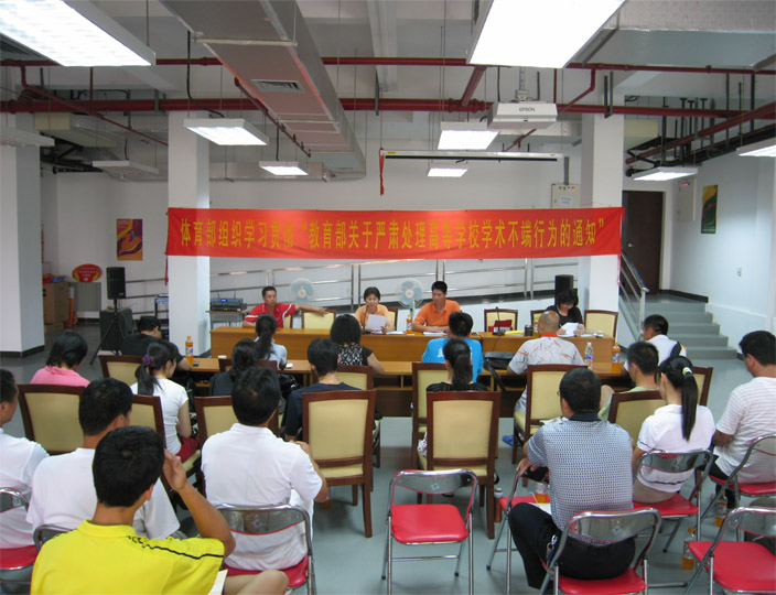本网讯 6月4日上午,体育部在南校区体育馆新闻发布厅召开了学习贯彻 “教育部关于严肃处理高等学校学术不端行为的通知”的会议,体育部全体专任教师参加会议,体育部主任林少娜主持会议。