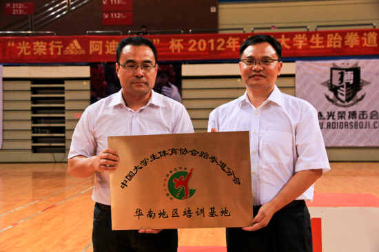 仪式最后,刘占鲁、刘建达为中国大学生体育协会跆拳道分会华南地区培训基地进行了授牌仪式,刘占鲁正式将中国大学生体育协会跆拳道分会华南地区培训基地牌匾授予我校。