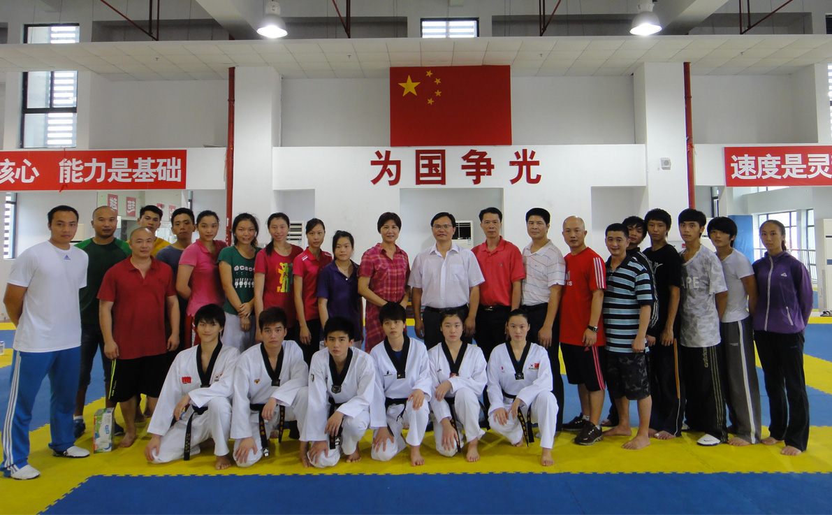 本网讯 在我国第九届大学生运动会(以下简称"大运会")即将召开之际,我校副校长、大运会广东省代表团副团长刘建达在体育部主任林少娜、党总支书记李旭武的陪同下,于8月28日上午赴广东省重竞技训练中心看望跆拳道队员。