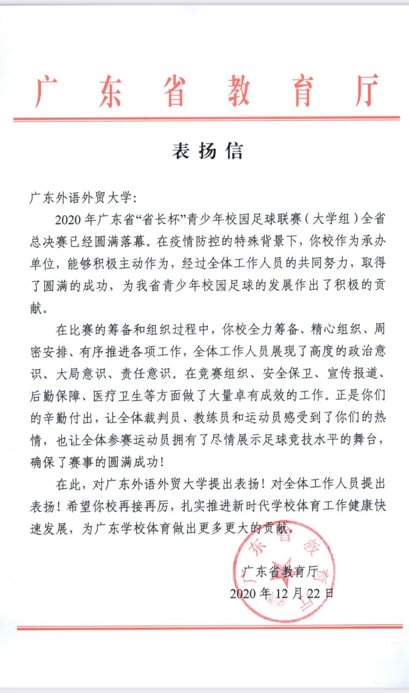 12月22日,广东省教育厅向我校发来表扬信,对我校在承办2020年广东省“省长杯”青少年校园足球联赛(大学组)全省总决赛中所作的积极贡献表示肯定,对全体工作人员的努力工作表示认可。