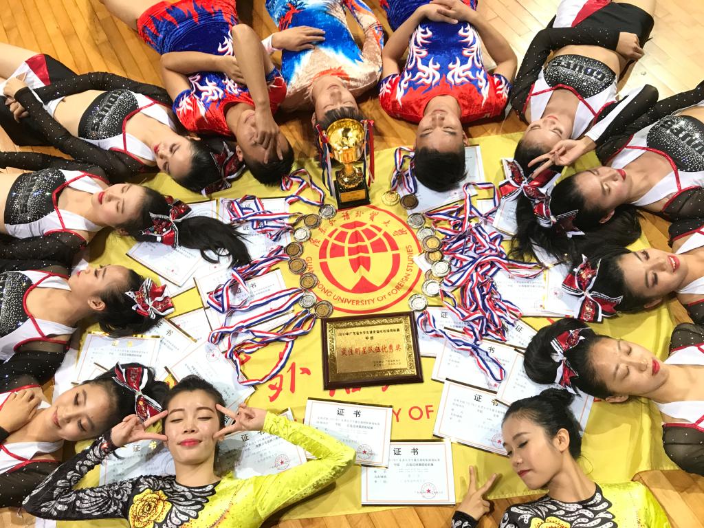 本次比赛广外健美操队共参加了竞技健美操、大众有氧轻器械健身操、花球舞蹈啦啦操和流行舞四个项目。其中,杜国宾、陈翰分别获得了竞技男子单人操第一名、第三名;林静怡、林芷琪分别获得了竞技女子单人操第二名、第四名;姚颖欣等获得了有氧轻器械健身操自选动作第三名;林静怡等获得了自选花球舞蹈啦啦操第二名;柳凤翎等获得了流行舞自选套路大集体第四名的好成绩,黎良发教练被评为优秀教练。
