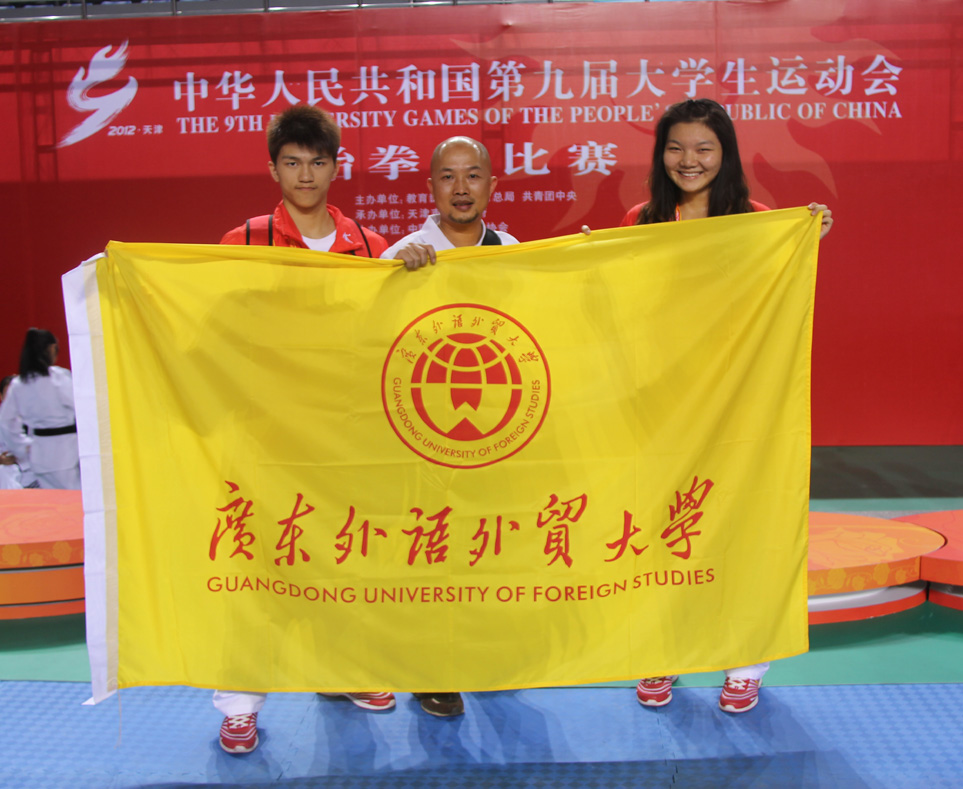 本网讯 2012年9月14日至2012年9月18日,我国第九届大学生运动会跆拳道比赛在天津市军事交通学院体育馆进行。广东队由来自广东外语外贸大学、广州体育学院等院校的18名健儿们组成,共参加了竞技12个项目和品势5个项目的比赛,我校体育部余中老师担任广东队教练。在本次大赛中,广东队共夺得一金三铜,六个项目排名第五。