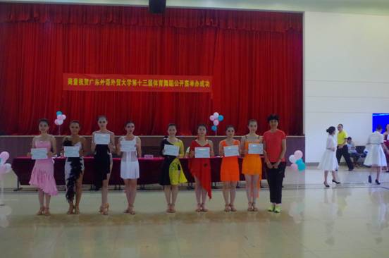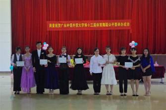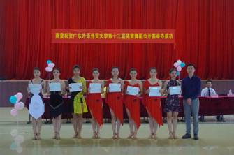 2018年6月7日,由广东外语外贸大学体育运动委员会主办,广东外语外贸大学体育部承办,广外绿精灵体育舞蹈协会协办的广东外语外贸大学第13届体育舞蹈公开赛在南校区学生活动中心拉开了序幕。出席本次比赛的领导和嘉宾有体育部主任林少娜教授、夏琼华教授、周俊飞副教授、师小蕴副教授、许正勇老师,热心校友霍泳珊女士、付关帆先生、董霄汉先生、陈晓霖先生,以及来自南北校区的体育舞蹈爱好者约200人共同见证了这场精彩、华丽的舞蹈盛宴。