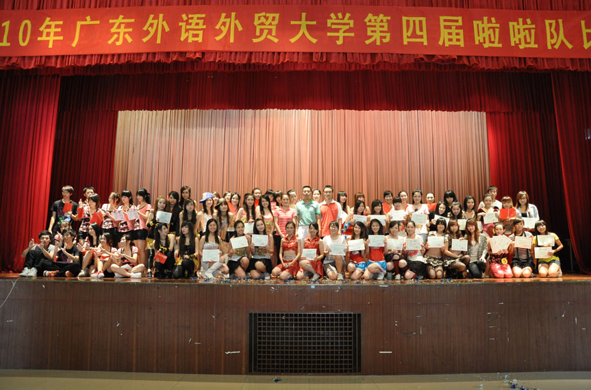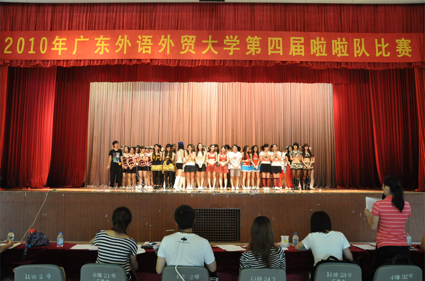 本网讯 6月10日下午,以“为亚运加油,为亚运喝彩”为主题的广东外语外贸大学第四届啦啦队比赛在南校区学生活动中心隆重举行。本次比赛由我校体育运动委员会主办,体育部承办,协办单位有我校健美操啦啦队协会以及各学院学生会体育部。体育部副主任丘乐威到场观看了比赛。本次比赛的评判长由我校健美操队教练、国家一级裁判员刘珺老师担任,国家一级运动员耿月、刘梦楠、孙粤思担任评分裁判。
